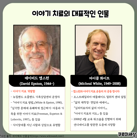 사회구성주의자 중 마이클 화이트와 데이비드 엡스턴(1990)은 이야기 치료 활용으로 많이 알려져 있다. 두 사람의 연구는 포스트모더니즘과 정신연구소에 연관된 이론가들의 영향을 받아왔다. 또한 내담자가 자신을 둘러싼 세상과 자신에게 일어난 사건을 어떻게 인식하고 있는지에 대해 관심을 가지고 있다.