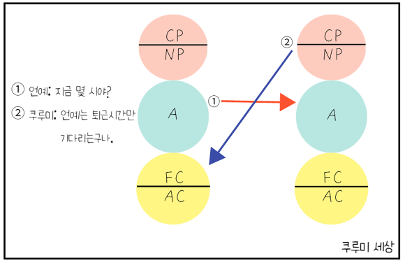 [ⓒ → ] | ⓒ에서의 발신은 어렸을 때와 마찬가지의 행동양식으로 정서적이며 자신의 생각대로 행동하거나 상대의 기분을 해치지 않도록 행동함 |