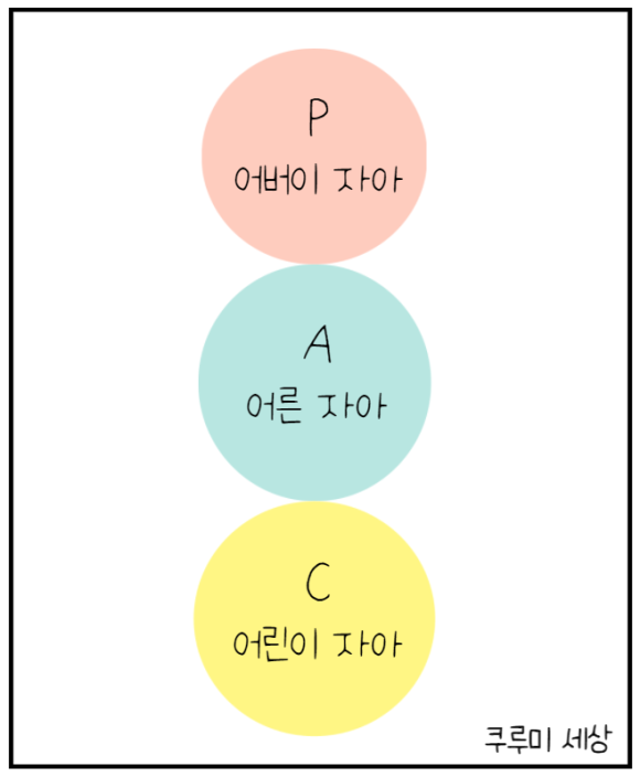 1. 어린이 자아(child ego: ⓒ 또는 C) 2. 어버이 자아(parent ego: ⓟ 또는 P) 3. 어른 자아(adult ego: ⓐ 또는 A) |