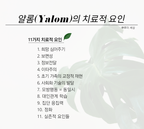 “집단은 집단성원들에게 문제가 개선될 수 있다는 희망을 심어주는데, 이때 희망 그 자체가 치료적 효과를 가질 수 있다.”