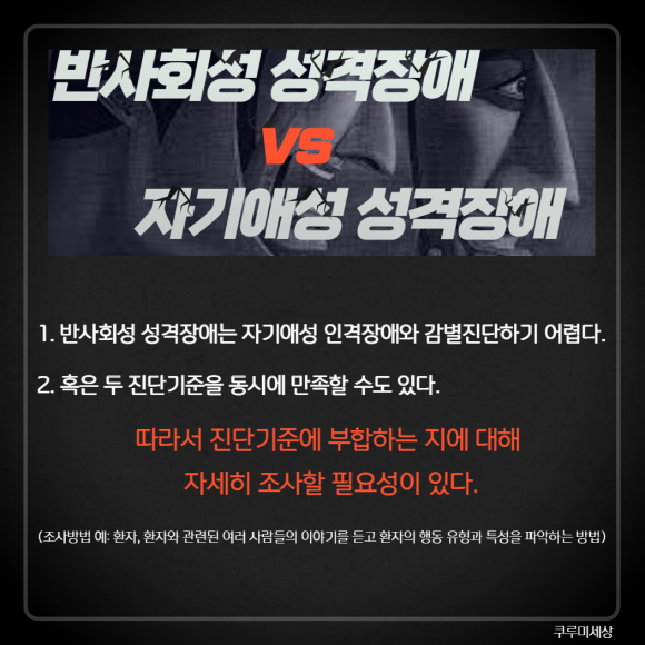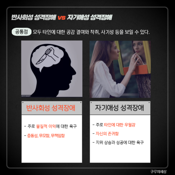 이 두 성격장애는 모두 타인에 대한 공감 결여와 착취, 사기성 등을 보일 수 있다. 반사회적 성격장애자들은 주로 물질적 이익에 대한 욕구를 충족시키기 위해 이런 행태를 보이며, 충동성, 무모함, 무책임함을 보이는 경향이 크다. 반면, 자기애성 성격장애자는 주로 타인에 대한 우월감과 자신의 존귀함, 혹은 지위 상승과 성공에 대한 욕구로 이런 행동 양식을 보인다.