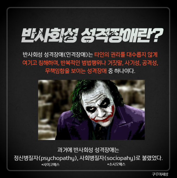 이로 인해 자신이나 사회에 부정적인 영향을 끼친다. 최근 대중화된 사이코패스(psychopath: 정신병질자), 소시오패스(sociopath: 사회병질자)라는 용어는 공식적인 진단명은 아니지만, 반사회적 성격장애자와 거의 비슷한 뜻이라고 생각하면 되겠다. 한 때 인터넷에서 유행하던 이른바 ’사이코패스 진단 검사’는 정신의학적 진단도구로 쓰이지 않는다.