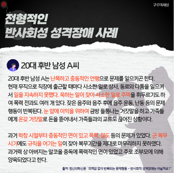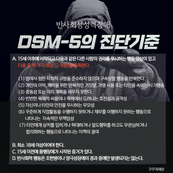 반사회성 성격장애의 DSM-5 진단기준은 위의 카드와 같다.