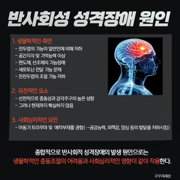마지막으로 종합적으로 보았을 때, 반사회적 성격장애의 발생 원인으로는 생물학적인 충동조절의 어려움(biological factor)과 사회심리적인 영향(psychosocial factor)이 같이 작용한다.