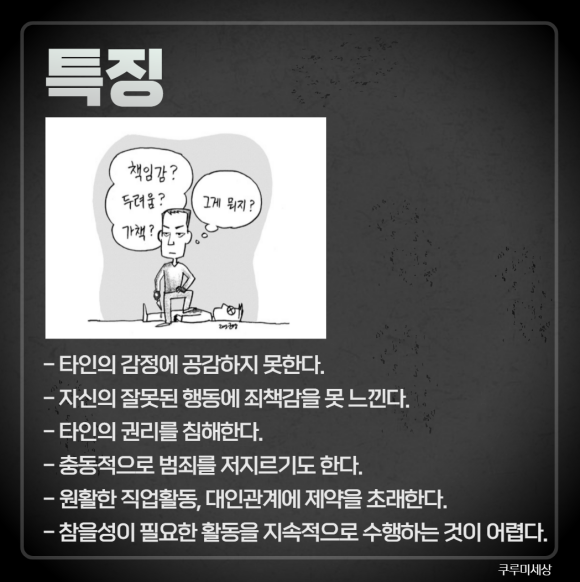 그리고 인지기능 중 공간지각 및 기억능력에 이상이 있어 충동적으로 위험한 자극을 추구한다는 설명도 있다.