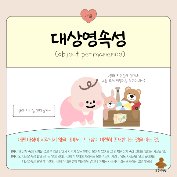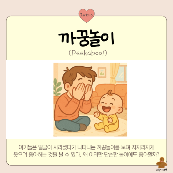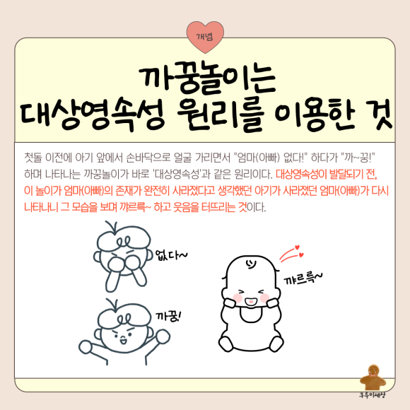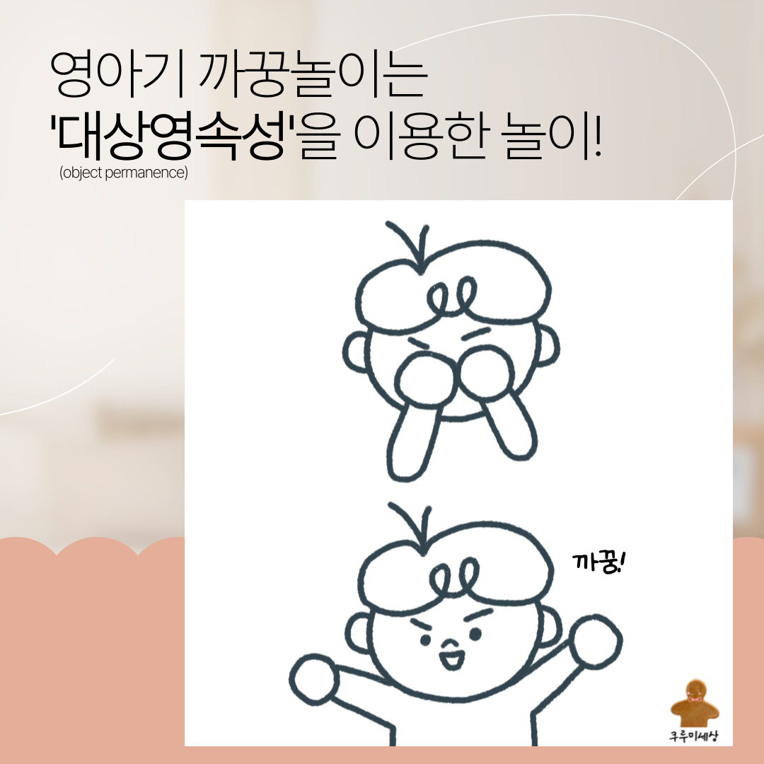 영아기때 아기는 눈앞에 사라진 물체 또는 대상에 대해 이해하지 못한다. 이 때문에 아기 앞에서 까꿍놀이를 하면 아기는 “꺄르륵~” 거리며 재미를 느낀다. 어른 관점에서는 얼굴을 그저 가렸다가 뗐을 뿐인데 아이는 이토록 좋아하는 이유는 뭘까?