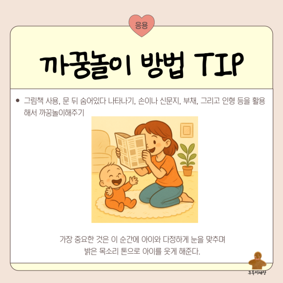 그림책 사용, 문 뒤 숨어있다 나타나기, 손이나 신문지, 부채, 그리고 인형 등을 활용해서 까꿍놀이를 해줄 수 있다. 이때 가장 중요한 것은 이 순간에 아이와 다정하게 눈을 맞추며 밝은 목소리 톤으로 아이를 웃게 해준다.