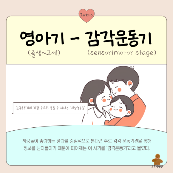 까꿍놀이 좋아하는 영아를 중심적으로 본다면 주로 감각 운동기관을 통해 정보를 받아들이기 때문에 피아제는 이 시기를 ‘감각운동기’라고 불렀다.