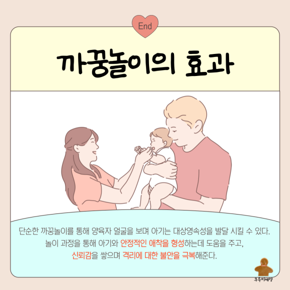 단순한 까꿍놀이를 통해 양육자 얼굴을 보며 아기는 대상영속성을 발달 시킬 수 있다. 놀이 과정을 통해 아기와 안정적인 애착을 형성하는데 도움을 주고, 신뢰감을 쌓으며 격리에 대한 불안을 극복해준다.