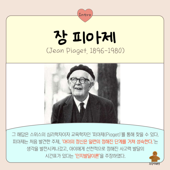 그 해답은 스위스의 심리학자이자 교육학자인 ‘피아제(Piaget)’를 통해 찾을 수 있다. 피아제는 처음 발견한 주제, ‘아이의 정신은 일련의 정해진 단계를 거쳐 성숙한다.’는 생각을 발전시켜나갔고, 아이에게 선천적으로 정해진 사고력 발달의 시간표가 있다는 ‘인지발달이론’을 주장하였다.